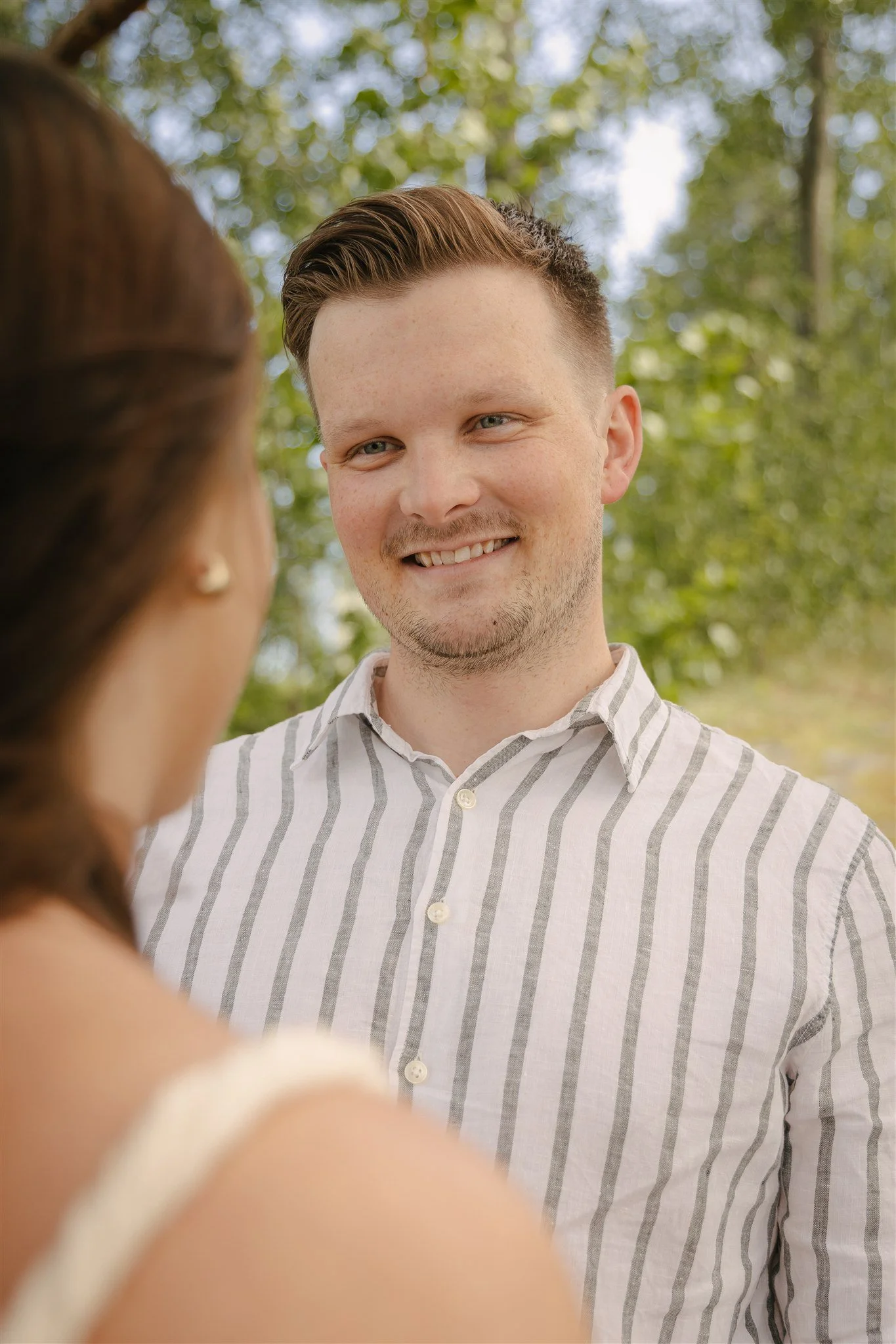 På Sundhaugen – det lille paradiset ved Vestfossen – var det som om naturen selv smilte sammen med dem. Vannet lå stille, trærne danset forsiktig i vinden, og midt i alt dette sto Thomas og Silje. Hånd i hånd, med latter som trillet gjennom lufta og blikk som aldri trengte å si så mye. For når kjærligheten er så trygg, så leken og full av humor, trenger man ikke store ord. Det holder med en liten dytt i siden, et blunk, et felles latteranfall som nekter å gi seg.